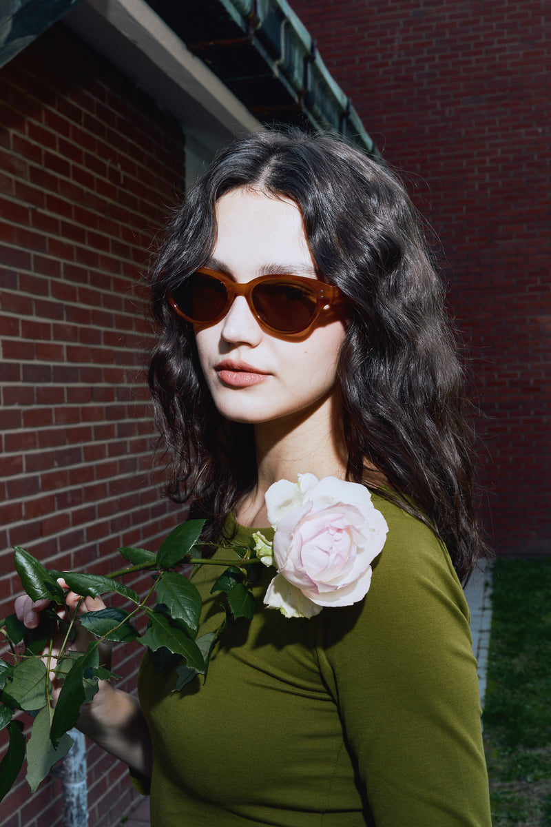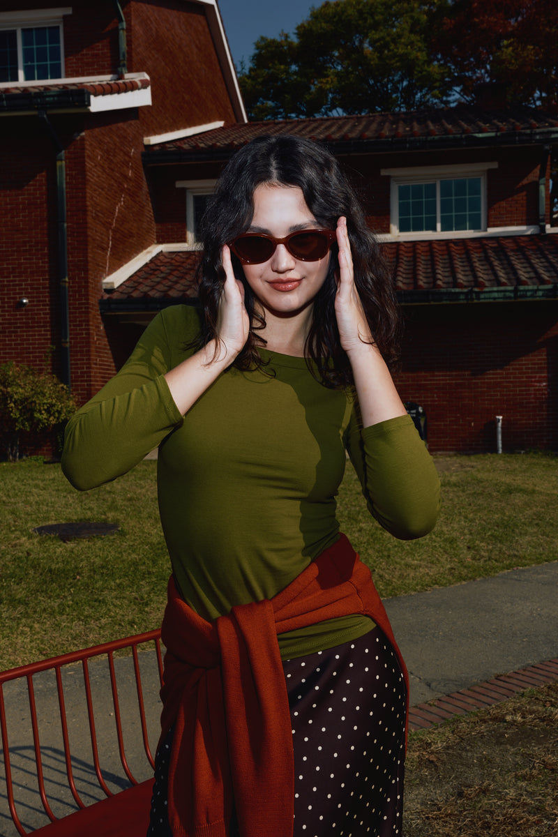 顔まわりに優しい陰影をつくり、穏やかなムードをまとわせる。